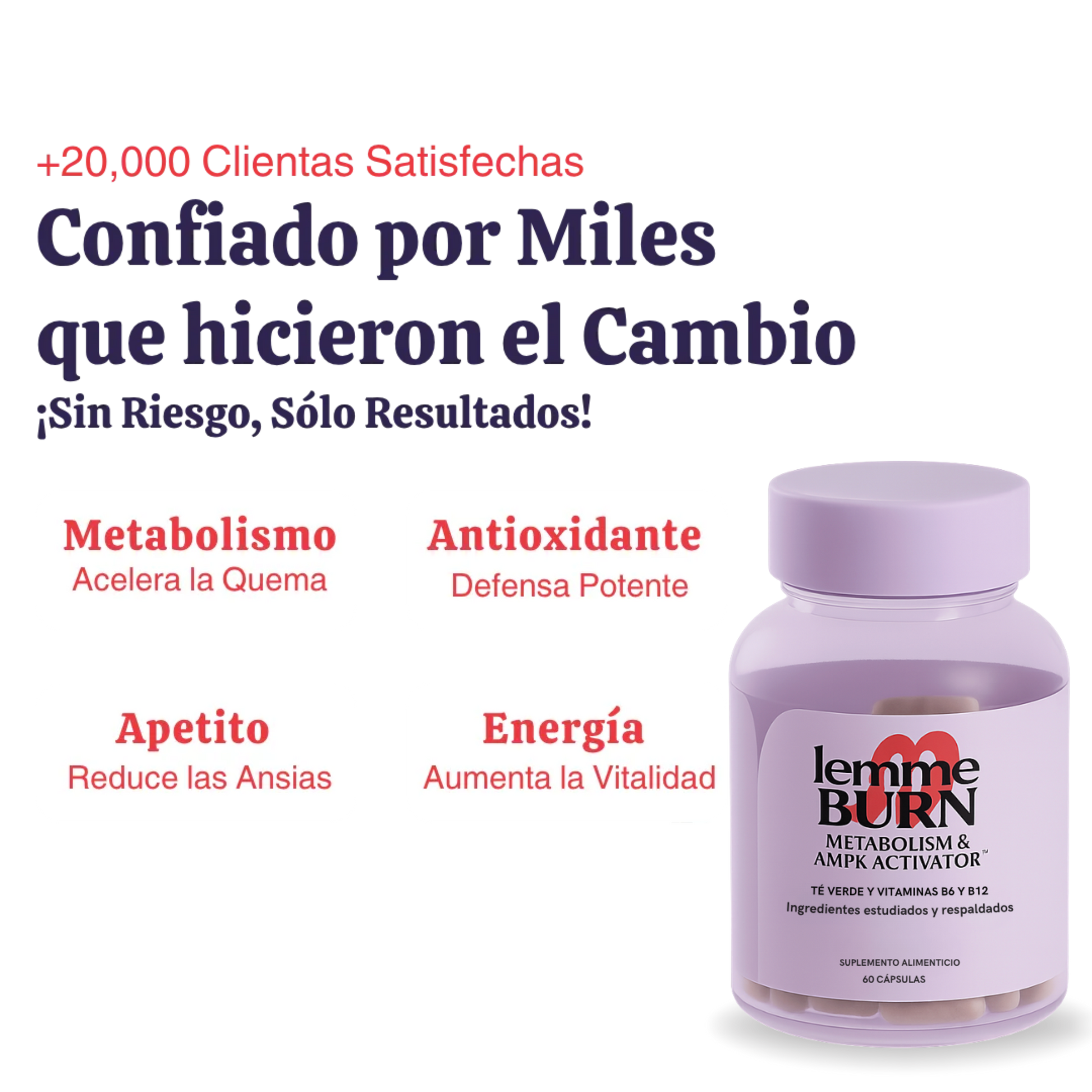 AMPK es una enzima que detecta el nivel de energía celular y ayuda a mantener el equilibrio energético. Esta función es clave para el metabolismo y la regulación de la saciedad. Con la edad, la actividad de AMPK disminuye, lo que provoca una regulación metabólica deficiente, un aumento del estrés oxidativo y una menor capacidad de "autolimpieza" celular (pérdida de grasa). Lemme Burn Activa tu AMPK, lo cual ayuda a acelerar el metabolismo y que vuelvas a quemar más grasa.